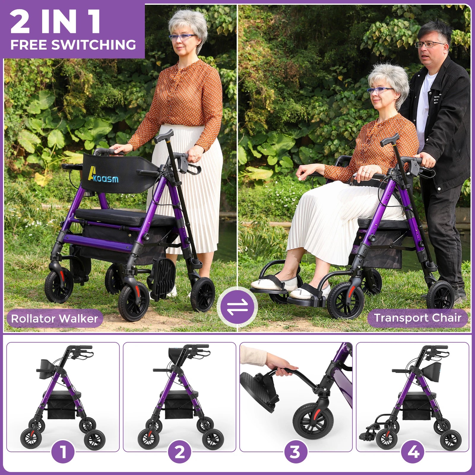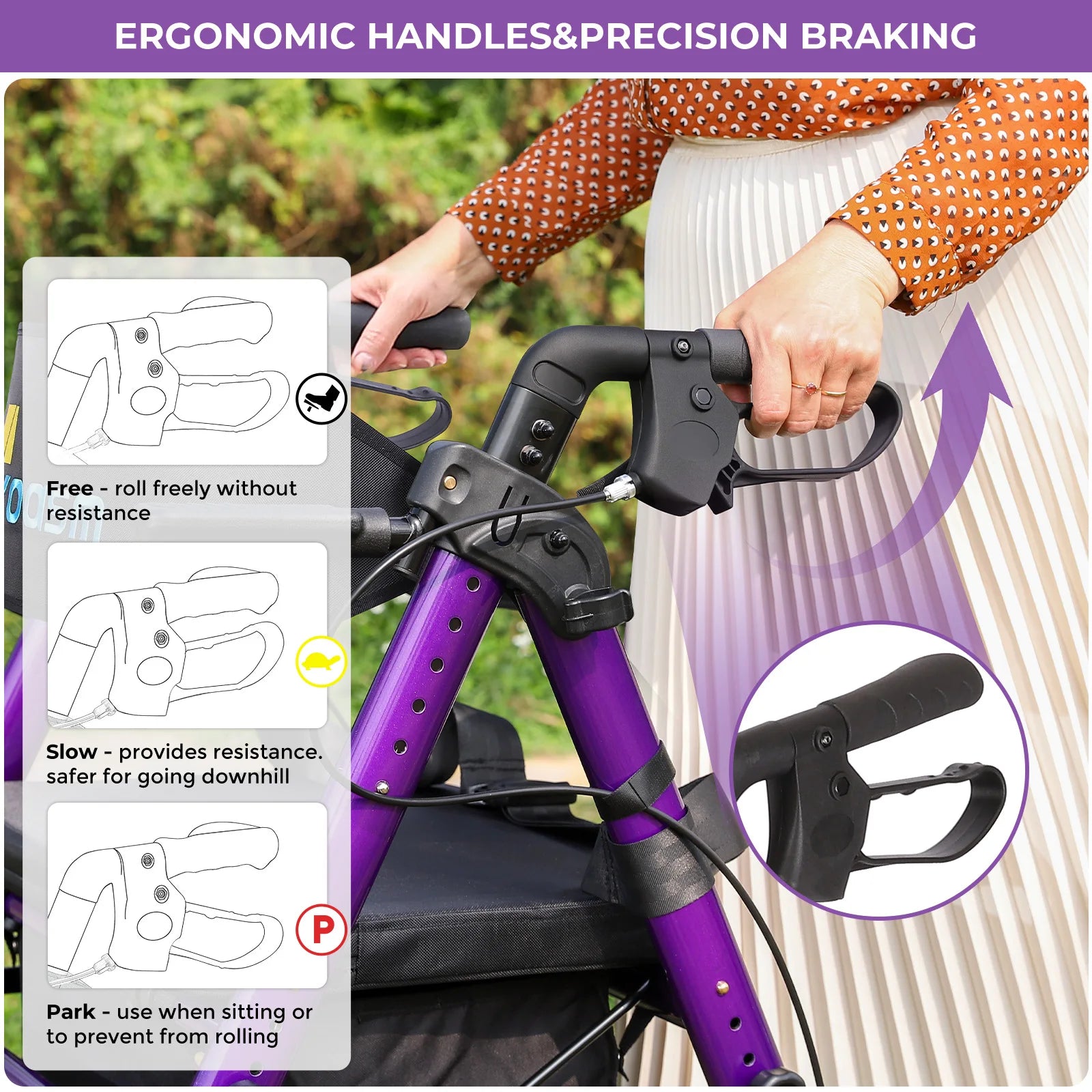 - Three-mode braking system (Free/Slow/Stop) plus safety features—upright auxiliary cane, waist and footrest straps, and reflective wheel strips—keep you secure even during tremors or fatigue.