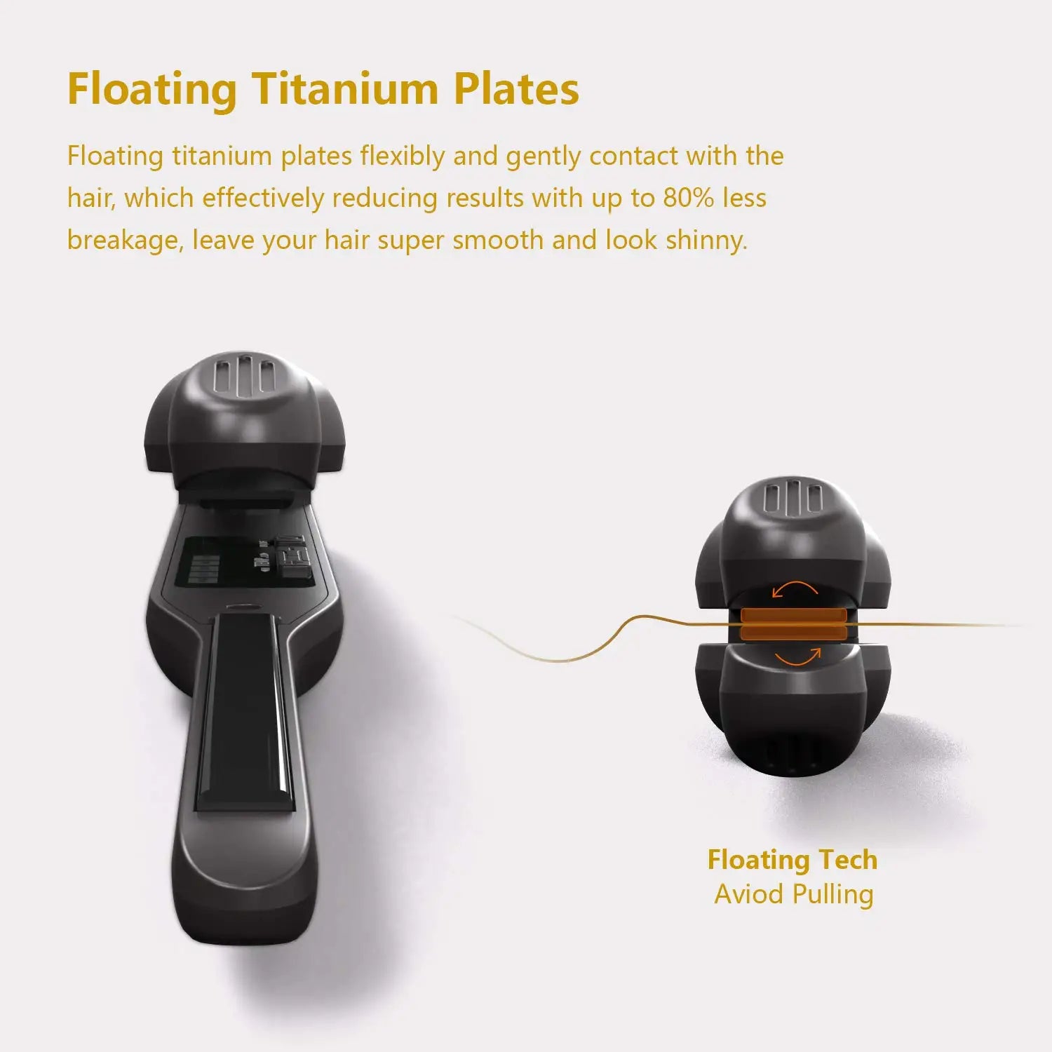 | This titanium iron heats up fast, bringing its plates back to the ideal temperature quickly after each pass, so you won’t need to go over each section multiple times and destroy your hair. | 60 Min Automatic OFFThe styler has an auto 60 minute shut off, so you can forget ever having to wonder if your flat iron is still on after you've left the house.(it is recommended to unplug the device every use) | Wide Heat Settings Ideal for All Hair TypesOne of the best features of this flat iron is its versatile temperature capabilities. Whether you have fine hair that needs less heat or a head full of curls that are begging for a higher temperature, you can find it all packed in this hair straightener. | 360° Swivel CordNo more tangled messes or twisted cords, with this hair straightener you can easily reach delicate fly-aways and seemingly invisible back sections without the hassle of a tangled or knotted cord ever again |